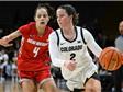 Colorado Buffaloes Kennedy Sanders, right, drives around New Mexico Lobos Alyssa Hargrove, left, at the CU Events Center in Boulder on Thursday, Nov. 6, 2025. (Matthew Jonas/Staff Photographer)...